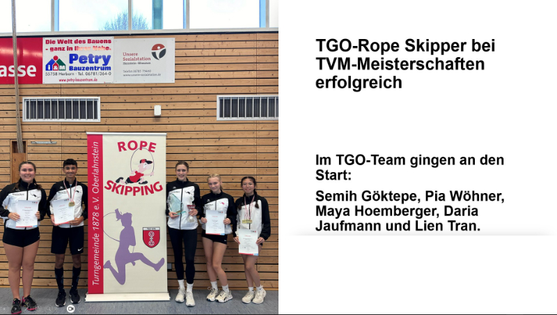 Im Rahmen des Internationalen Deutschen Turnfests, dem weltweit größten Wettkampf- und Breitensportfestival, fanden am 29. Mai 2025 in Leipzig die Deutschen Meisterschaften im Rope Skipping statt. Die TGO wurde von Semih Göktepe (AK I, männl.) und Pia Wöhner (AK I, weibl.) vertreten. Beide gingen mit dem Ziel in den Wettkampf, eine Qualifikation für das internationale Parkett mitzunehmen.