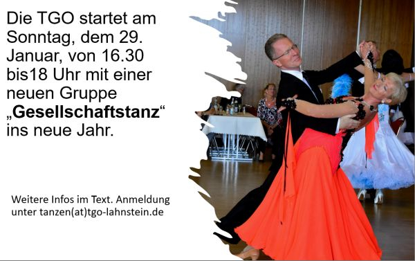 Die TGO startet am Sonntag, dem 29. Januar, von 16.30 bis18 Uhr mit einer neuen Gruppe „Gesellschaftstanz“ ins neue Jahr. Die mehrfachen Landesmeister in den Standard- und in den lateinamerikanischen Tänzen, Ulrike und Bob Schneider, werden in der neuen TGO-Halle (Lahnstein, Westallee 9) tanzfreudigen Paaren ab 16 Jahren die Grundlagen in Wiener Walzer, Cha Cha Cha und anderen Tänzen des Welttanzprogramms vermitteln. Auch Einzelpersonen sind herzlich willkommen. Möglicherweise lässt sich dabei auch ein Tanzpartner oder eine Tanzpartnerin finden. Tanzen ist eine der gesündesten Sportarten, die Körper und Geist fördern, den Alltag vergessen lassen und bis ins hohe Alter auf allen möglichen Anlässen betrieben werden können.