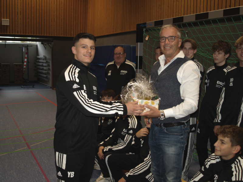 Nach der Übergabe der Trainingsanzüge, die sofort für ein gemeinsames Foto angezogen wurden, bedankte sich die Mannschaft mit einem kleinen Dankeschön bei ihrem Sponsor.