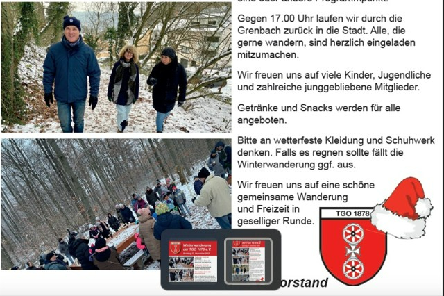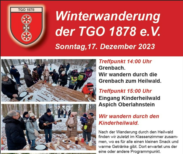Die TGO ländt zur diesjährigen Winterwanderung am Sonntag, dem 17.12.2023, 14:00 Uhr, Grenbach, ein. Weiteres siehe Plakat.
