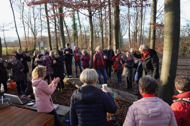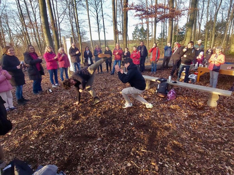 Nach ihrem Debüt im vergangenen Jahr lud die Turngemeinde Oberlahnstein erneut zur „Winterwanderung“ durch den Lahnsteiner Heilwald als Alternative zur üblichen Vereinsweihnachstfeier auf den Aspich ein. Statt der winterlichen Schneelandschaft im vergangenen Jahr erwarteten die zahlreichen Vereinsmitglieder eine wenn auch kalte, aber doch sonnige Winterlandschaft auf der Lahnhöhe. Die wanderlustigen Mitglieder waren bereits rechtzeitig über den Grenbachpfad durch die sonnige und frische Luft hoch gewandert, während sich die übrigen Mitglieder gleich am Eingang des Kinderheilwalds einfanden. Dort ging man entlang der angelegten Wege durch den Kinderheilwald und traf sich schließlich im sogenannten „Klassenzimmer“, einer Sammelstelle mit Tischen und Bänken in Mitten des Heilwaldes. Dort erwarteten die TGO-Mitglieder heißer Glühwein, Kinderpunsch, Schmalzbrote und Plätzchen. Die Capoeiragruppe zeigte eine kurze Demonstration ihrer Bewegungselemente aus dem Trainingsalltag, zudem wurde einige Adventslieder auf der Gitarre gespielt zum Mitsingen. Allen Beteiligten hatte diese etwas andere Vereins-Weihnachtsfeier gut gefallen und bot Gelegenheit zu manchem netten Gespräch bei einem Becher Glühwein oder Punsch.