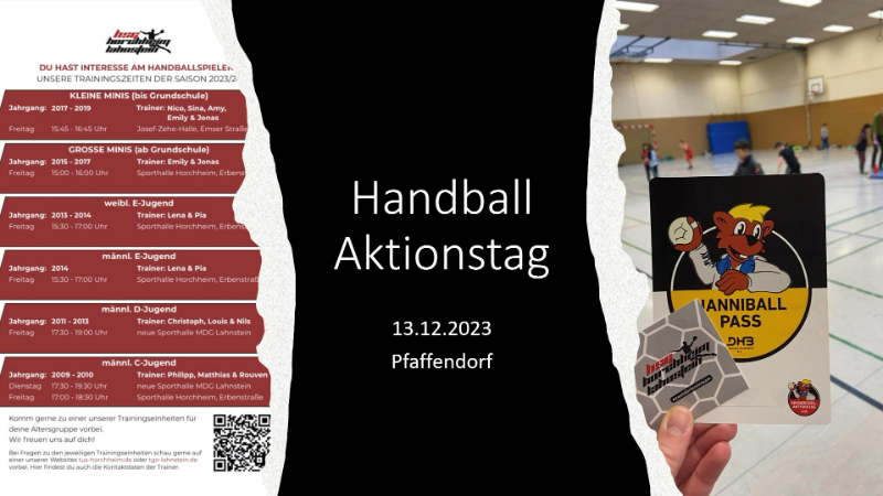 Am 13.12. fand in der Grundschule Pfaffendorf unter Leitung der Trainer der Handballspielgemeinschaft Horchheim-Lahnstein ein DHB-Handballaktionstag statt. An 5 Stationen konnten die Kinder der 2. bis 4. Klasse ihr Fertigkeiten beim Prellen, Werfen, Fangen und Laufen unter Beweis stellen. Zum Abschluss durfte natürlich ein kleines Abschlussspiel nicht fehlen. Belohnt wurden die Kids mit dem DHB Hanniball Pass, sowie einem HSG Sticker und einer kleinen Süßigkeit. Ein Dank ging an alle Unterstützer für den interessanten Tag, von dem die Initiatoren hoffen, das eine oder andere Kind für den Handballsport zu gewinnen.
