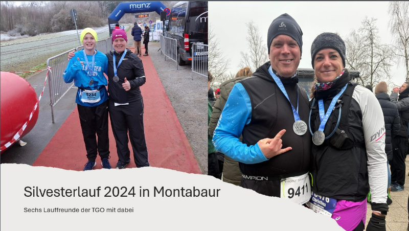 Am letzten Tag des Jahres 2024 gesellten sich gleich 6 Lauffreunde der Turngemeinde Oberlahnstein zum Jahresausklang zum Silvesterlauf in Montabaur, bei dem zum 25-jährigen Bestehen dieses Jahr über 2100 Teilnehmer gemeldet waren. Die Laufstrecke startet in Montabaur beim Mons-Tabor-Bad und verlief über das Waldgebiet bei Horressen. Bei trockener Witterung und Temperaturen knapp unter dem Gefrierpunkt war es zwar kalt, aber immerhin trocken, windstill und die Laufwege waren zur Freude der Teilnehmer nicht allzu matschig. Immerhin galt es beim 5km-Lauf 70 und beim 10km-Lauf 150 Höhenmeter zu bewältigen. Brigitte Esten und Andreas Thielen von der TGO liefen die 5km Strecke. Brigitte erreichte in ihrer Altersklasse W50 den 22. Platz in einer Zeit von 33,51 Minuten. Andreas aus der Leichtathletikgruppe U12/U14 der TGO durchlief als 7. seiner Altersklasse M10/M11 überglücklich nach 26,36 Minuten den Zielbogen. Über die 10 km-Distanz starteten unter der TGO vier Athletinnen bzw. Athleten. Hier erreichte Sebastian Künzler (M40) den 48. Platz in 56:03, Jennifer Hamm (W55) den 16. Platz in 1:07,39, Christina Pörtner (W40) den 27. Platz in 1:02:34 und Alexander Krebs (M45) den 22. Platz in 1:10,24.