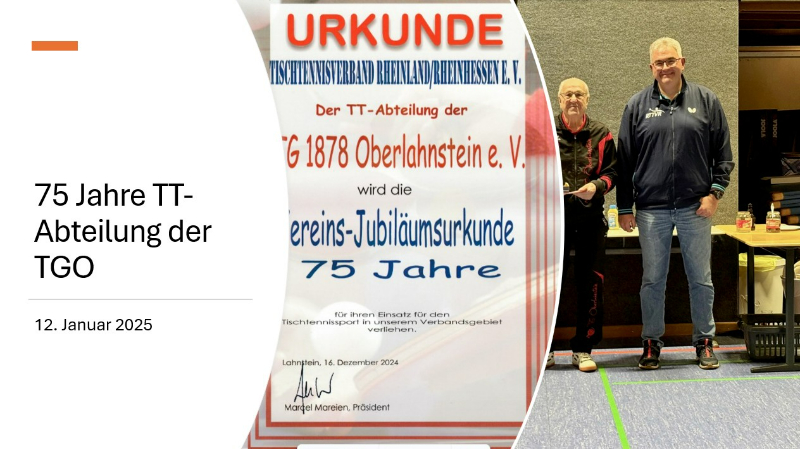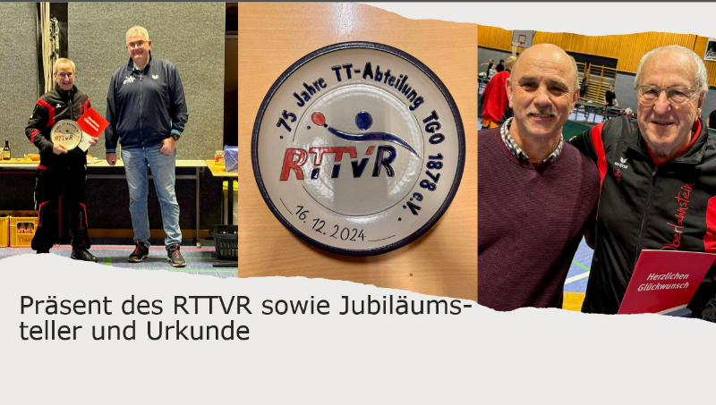 Wir gratulieren herzlich allen Aktiven und Übungsleitern für die lange sportliche Aktivitäten im Tischtennissport. Abteilungsleiter Werner May nahm anlässlich dieses Jubiläums ein Präsent des RTTVR sowie Jubiläumsteller und Urkunde von Frank Günter vom Tischtennisverband entgegen, der einen Ehrenplatz bekommen wird. Ein besonderer Gruß und Glückwunsche gehen aber auch an Willi Lambrich, der auf stolze 70 Jahre (!) aktives Tischtennisspielen in der TGO zurückblicken kann und von Frank Günter dafür die Verbandssiegermedaille überreicht bekam. TGO-Vorsitzender Dr. Peter Radermacher ließ es sich nicht nehmen, dem Jubilar persönlich zu gratulieren.