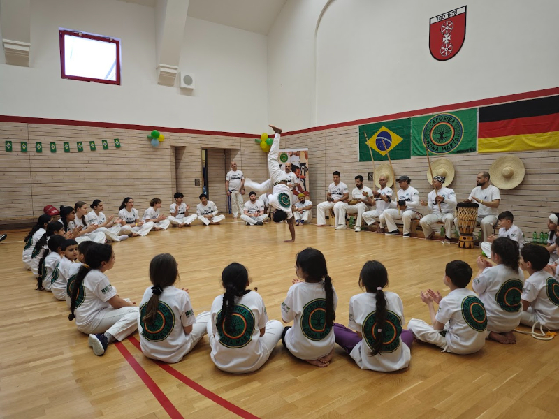 Begleitet wurden die Zeremonien von renommiertem Meister, Schülern, Familien und Freunden, die mit großer Begeisterung dabei waren. Sie feuerten die Capoeiristas an, erlebten die emotionale Bedeutung der Rituale hautnah mit und feierten gemeinsam die Erfolge der Schüler und Lehrer. Neben den sportlichen Highlights gab es am Abend eine brasilianische Party mit Livemusik, bei der Teilnehmer und Gäste den Tag ausgelassen ausklingen ließen. Mit traditioneller Musik, Tanz und guter Stimmung wurde das Gemeinschaftsgefühl weiter gestärkt und die brasilianische Kultur in all ihren Facetten gefeiert. Während des gesamten Wochenendes wurde die vereinseigene Sporthalle mit den typischen Rhythmen der Berimbau und den energiegeladenen Bewegungen der Capoeiristas erfüllt. Neben den Zeremonien gab es Workshops mit erfahrenen Lehrern, spannende Roda-Runden und einen regen Austausch zwischen den Teilnehmern.