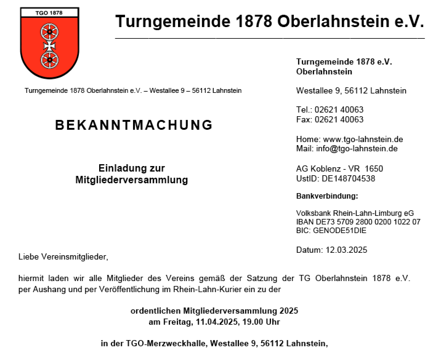 Interessenten melden sich bitte bei Marlene Feider unter 02621/610914 oder per Mail unter marlene.feider@tgo-lahnstein.de