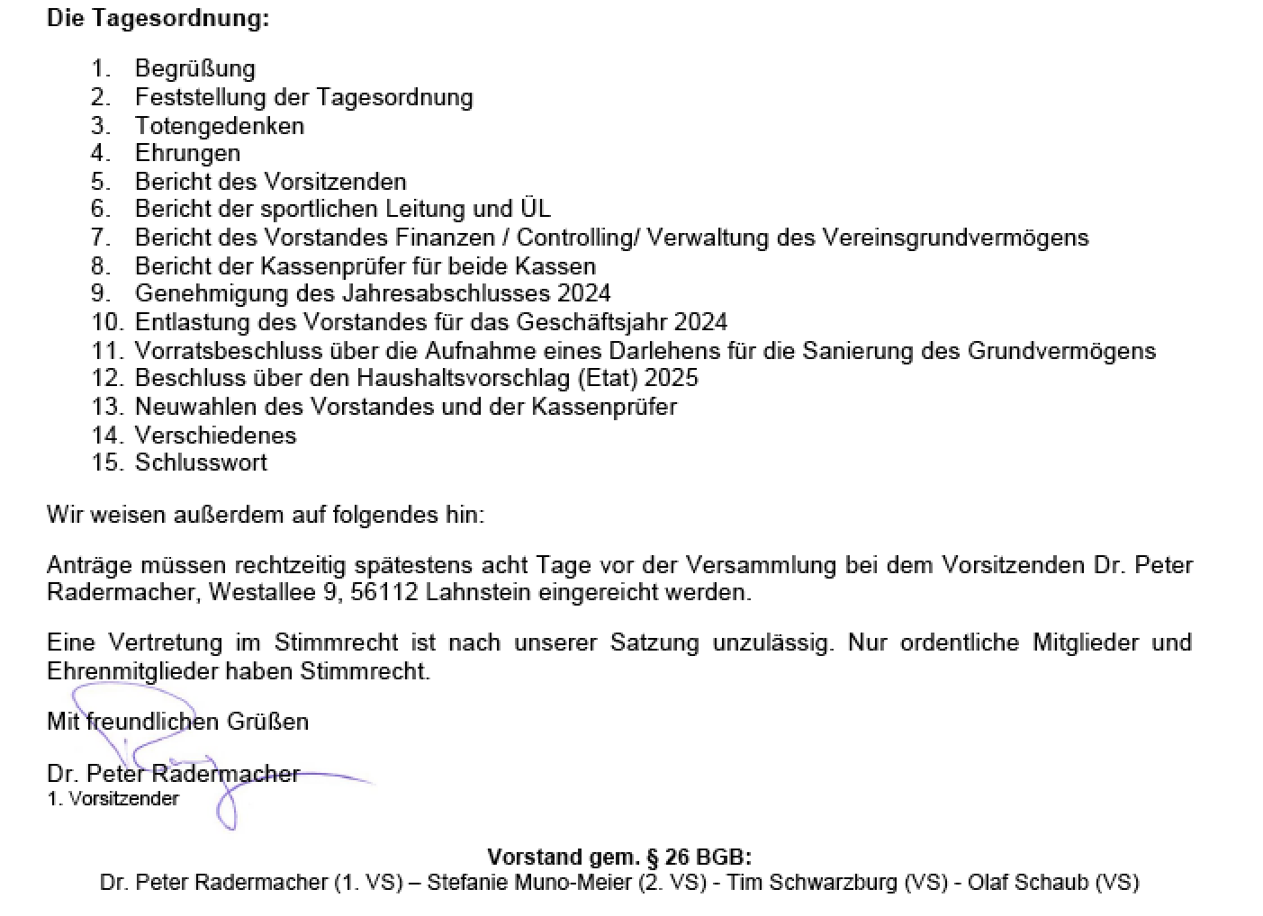 Anträge müssen rechtzeitig spätestens acht Tage vor der Versammlung bei dem Vorsitzenden Dr. Peter Radermacher, Westallee 9, 56112 Lahnstein eingereicht werden.
